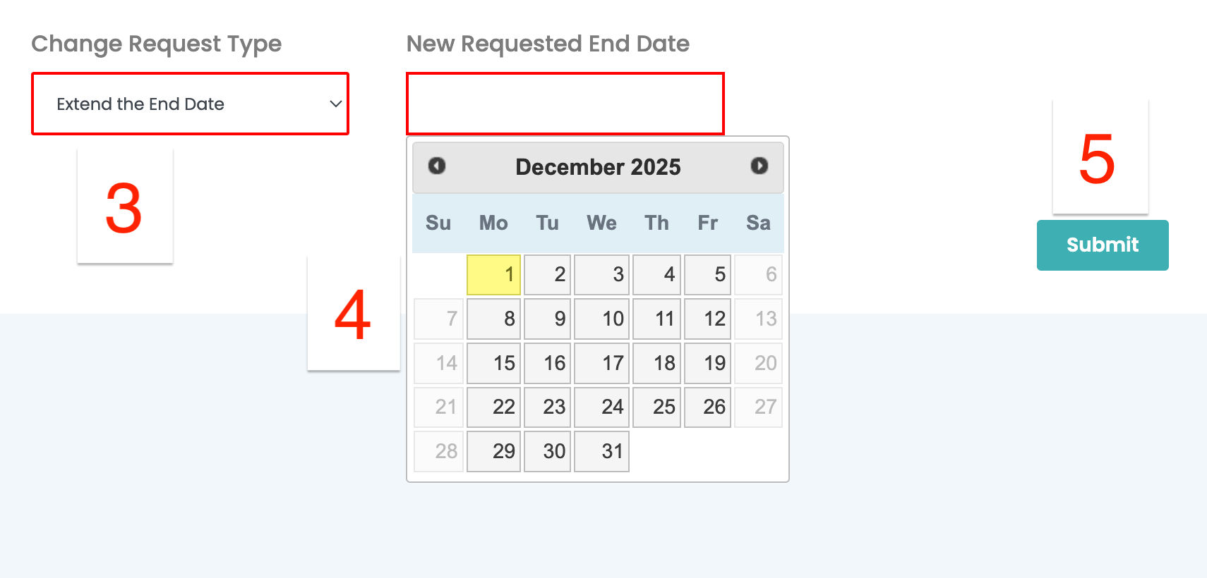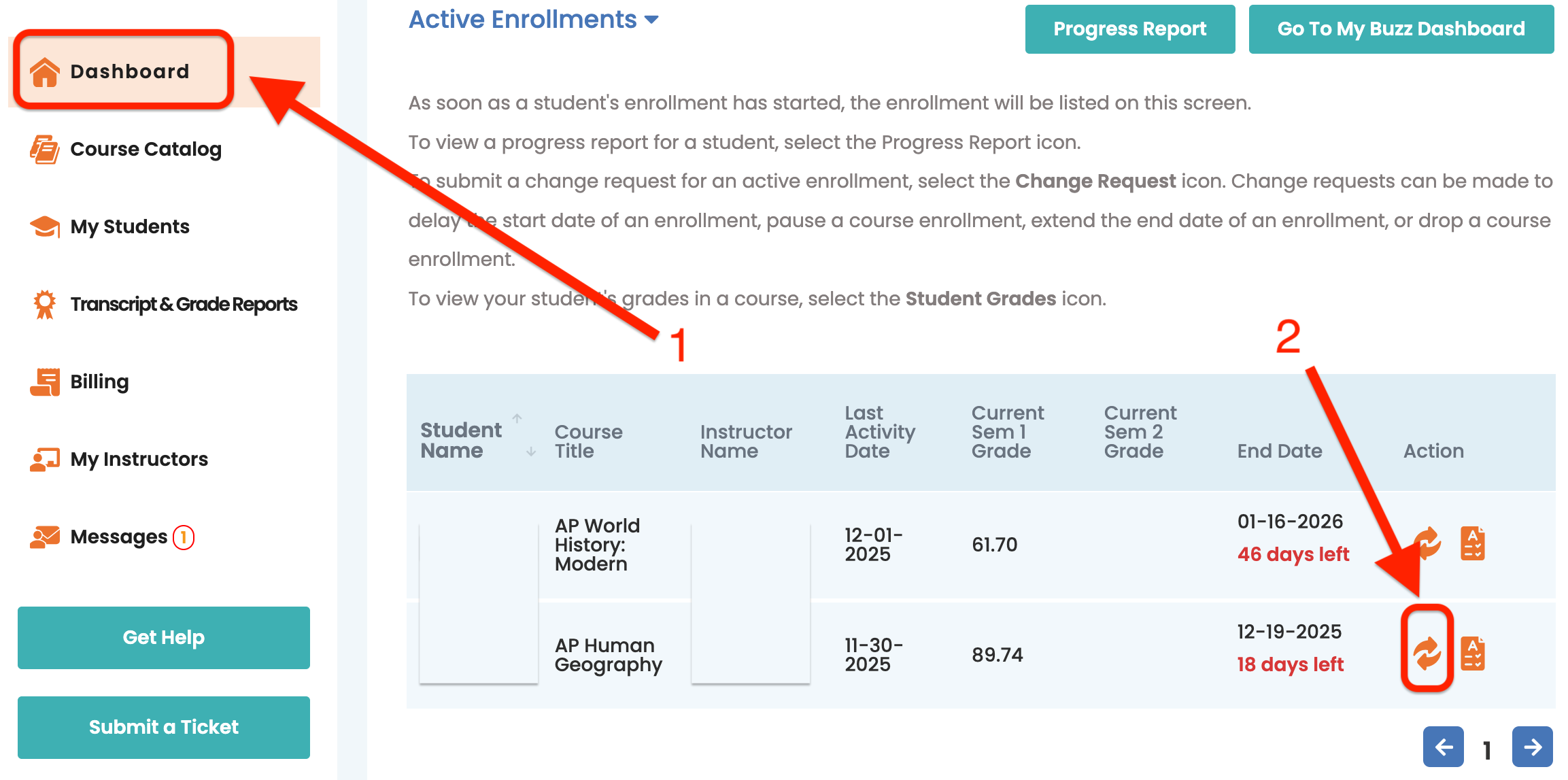 If the student/course isn't on your dashboard: Log in to MCP. Select Enrollments from the left-hand menu and select Planned or Active. All the way to the right, select the Change Request icon next to the enrollment you want to change. Select Extend ...